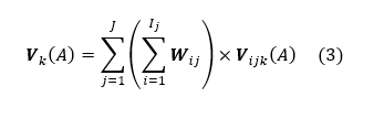 Reemplazando la ecuación (2) dentro de la ecuación (1) se obtiene el valor global de la alternativa respecto a la vereda VK (A), ecuación (3), donde es igual a la sumatoria respecto a las veredas de la sumatoria de los pesos Wij respecto a los índices y criterios multiplicado el valor de la alternativa respecto al indicador, criterio y vereda.