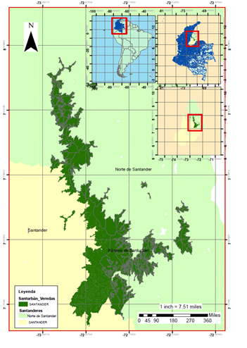 El Páramo de Santurbán se encuentra ubicado en el extremo nororiental de la Cordillera Oriental de Colombia, y tiene jurisdicción directa en dos departamentos: Santander y Norte de Santander (Figura 1). Además, se encuentra conformado por 29 municipios, abastece de agua a estos municipios y a una población de más de 2.200.000 de habitantes para un total de 98.000 hectáreas. Para este estudio se va a trabajar a un nivel de detalle de 1:25.000.