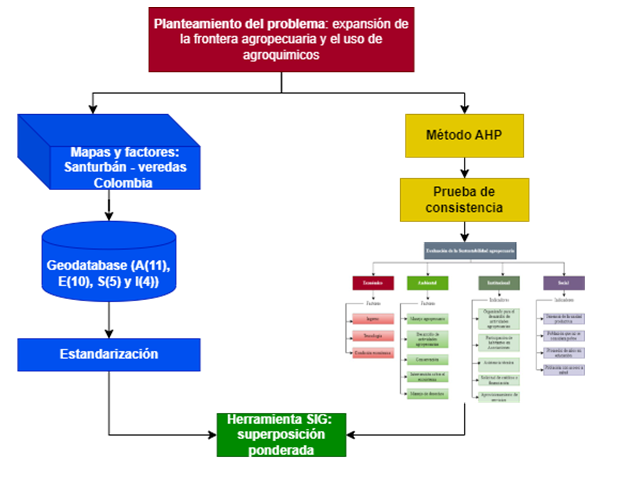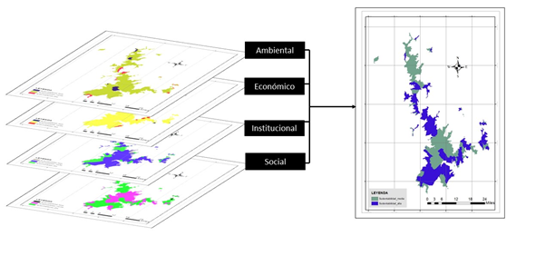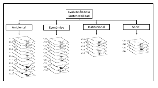 La metodología propuesta se basa en la superposición espacial de variables, en donde a cada criterio se le asigna un peso de acuerdo con su importancia. A su vez, a todos los indicadores que constituyen un criterio se les asigna un peso de acuerdo con su importancia, dado por el trabajo de expertos dentro de la evaluación de sustentabilidad productiva.