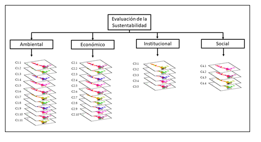 Los trabajos presentados en la Tabla 1 sobre evaluación de la sustentabilidad han partido su análisis de cuatro criterios para analizar la sustentabilidad: ambiental, social, económica e institucional. En la Figura 2, como se mostró, se presenta un resumen gráfico de los indicadores que fueron seleccionados para realizar la evaluación de sustentabilidad, los cuales fueron agrupados respectivamente por factores y criterios, respectivamente: ambiental (11), económico (10), institucional (5) y social (4). Los indicadores fueron estandarizados dentro del rango entre O y 1.
