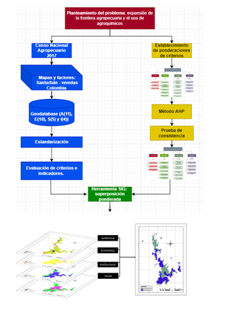 El diagrama (Figura 7) muestra el proceso del AMC, se presenta la visión de manejo para la asignación de los pesos por criterio, factor e indicador de acuerdo con el método AHP, después de la gestión de los pesos se corre el modelo espacial a través de la herramienta superposición ponderada.