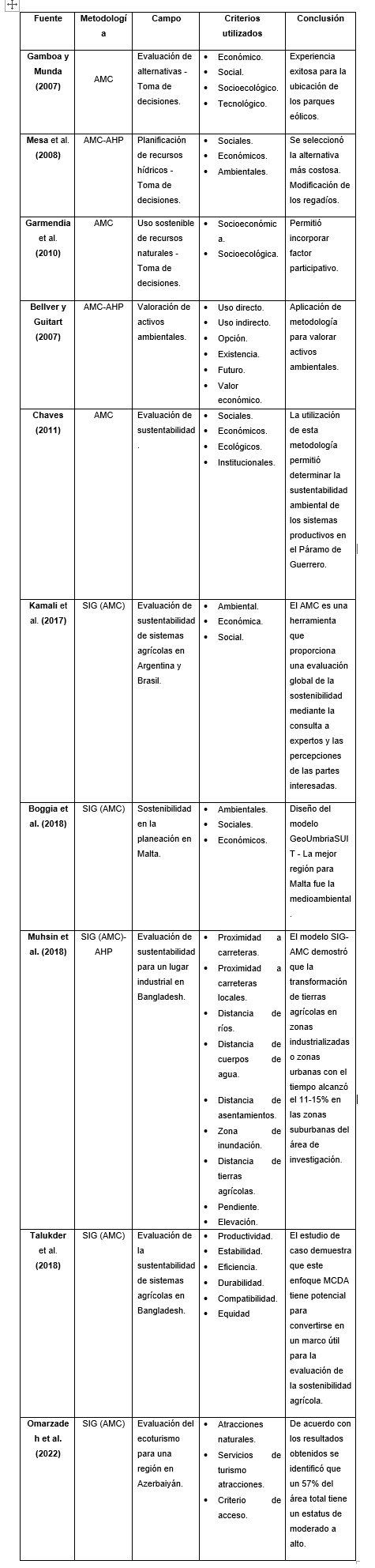 A continuación, se presenta una revisión de trabajos que han abordado la herramienta que ha sido incorporada al SIG como lo es el Análisis Multicriterio —AMC— (Tabla 1).